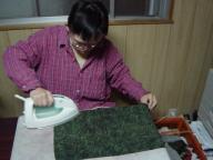 また、着物を雑貨にリサイクルするための準備として、着物を適当な大きさに切りアイロンがけを行なう作業を行なっています。しわしわになっている着物に一枚一枚丁寧にアイロンをかけておられる姿がとても印象的でした。